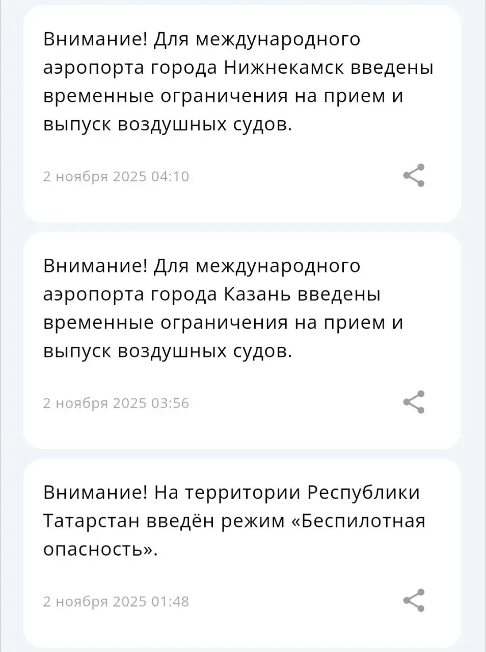 Ночью 2 ноября в Республике Татарстан был объявлен режим «Беспилотная опасность». Уведомление об этом поступило в приложение МЧС России в 01:49.