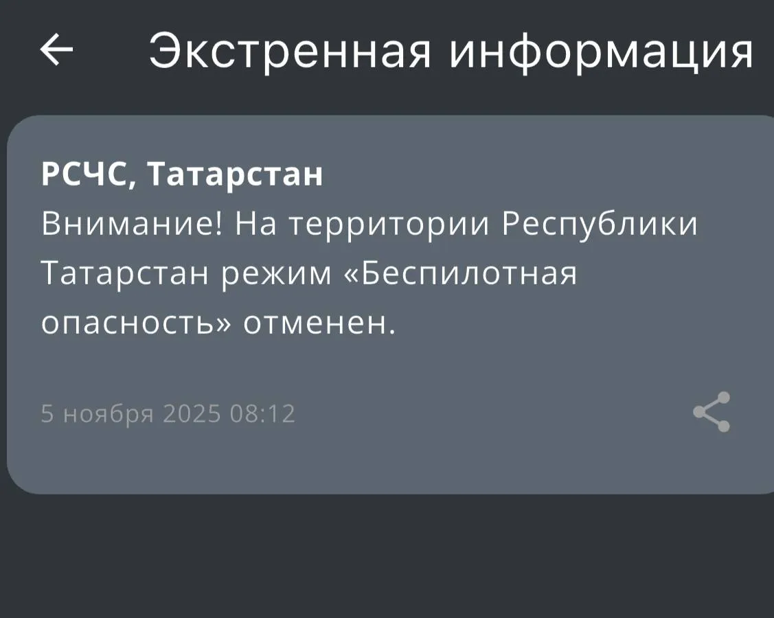 В Татарстане в 08:12 отменили режим «Беспилотная опасность». Об этом сообщили в официальном приложении МЧС России.