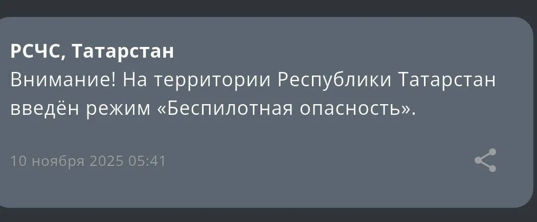 В Татарстане с 05:41 введен режим беспилотной опасности. Такую информацию МЧС России направило через свое мобильное приложение.