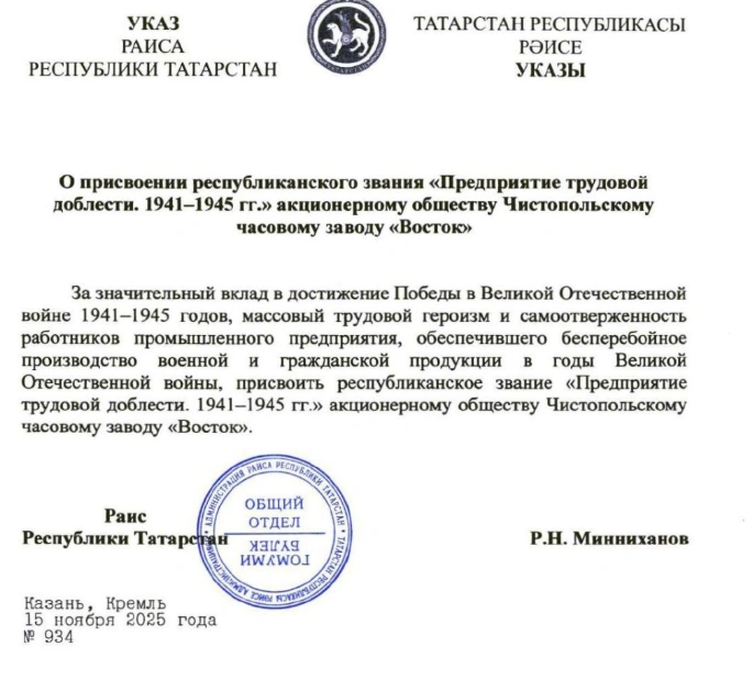 Чистопольский часовой завод «Восток» получил звание «Предприятие трудовой доблести. 1941–1945 гг.» указом Раиса Татарстана Рустама Минниханова. Признание связано с важным вкладом предприятия в Победу в Великой Отечественной войне.