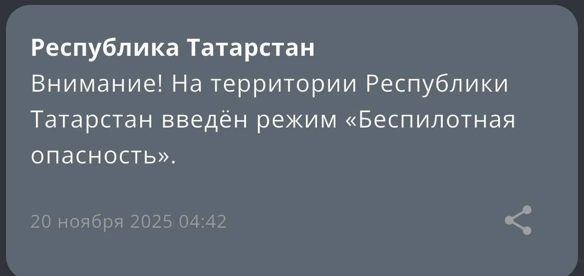 В Татарстане с 04:42 введен режим беспилотной опасности. Такую информацию МЧС России направило через свое мобильное приложение.