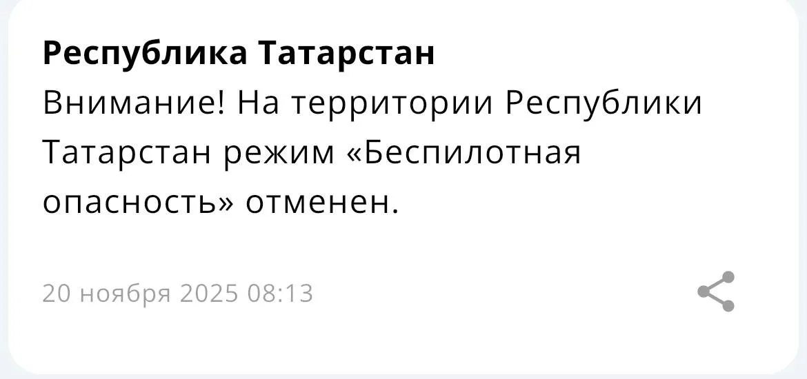 В Татарстане отменили режим беспилотной опасности. Об этом МЧС России сообщило через своё приложение в 08:13 по московскому времени.
