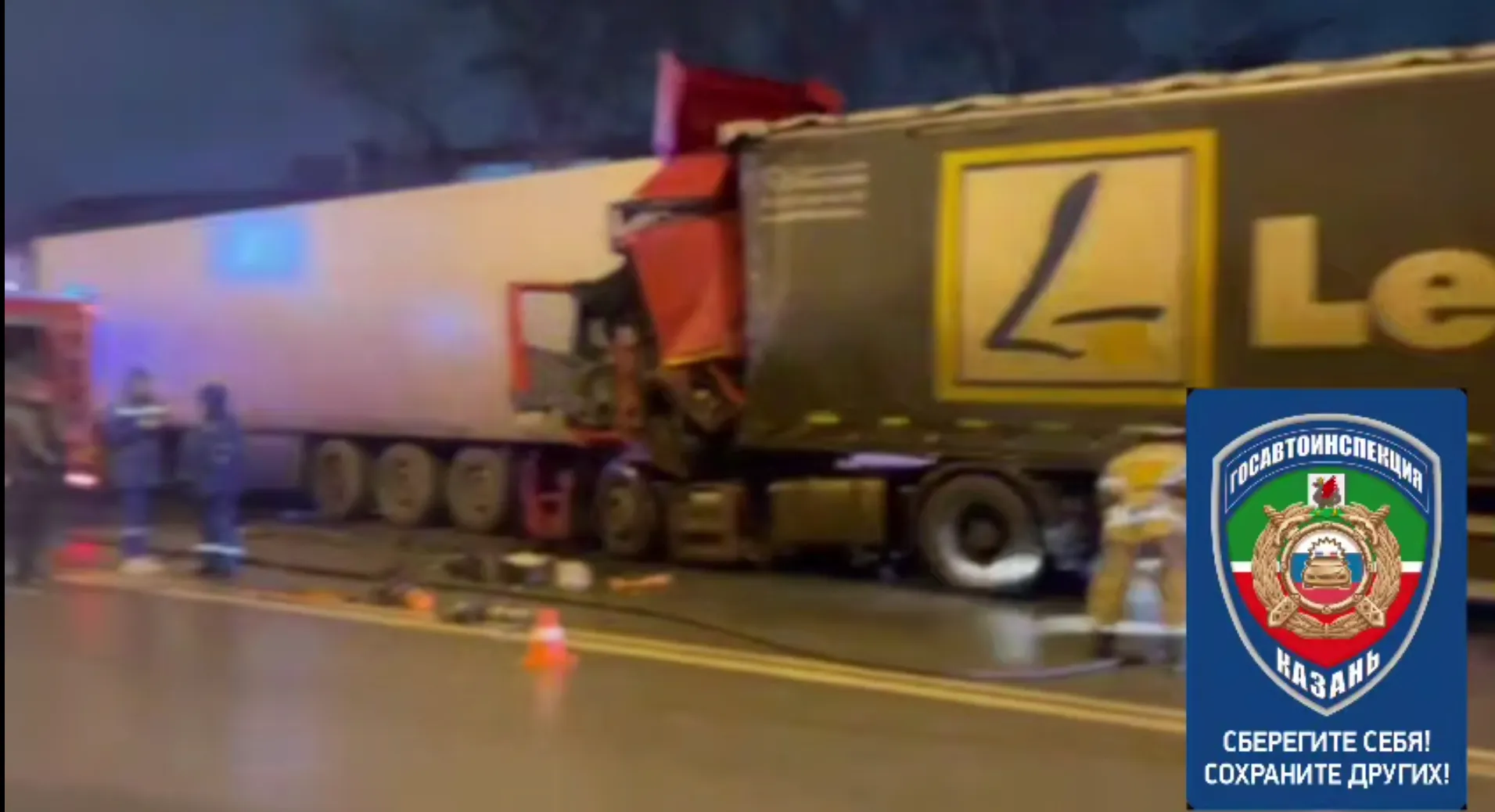В Московском районе Казани на улице Васильченко водитель «КамАЗа» с прицепом на высокой скорости въехал в припаркованный полуприцеп Schmitz в составе грузового автомобиля DAF. Об этом сообщили в Госавтоинспекции города.