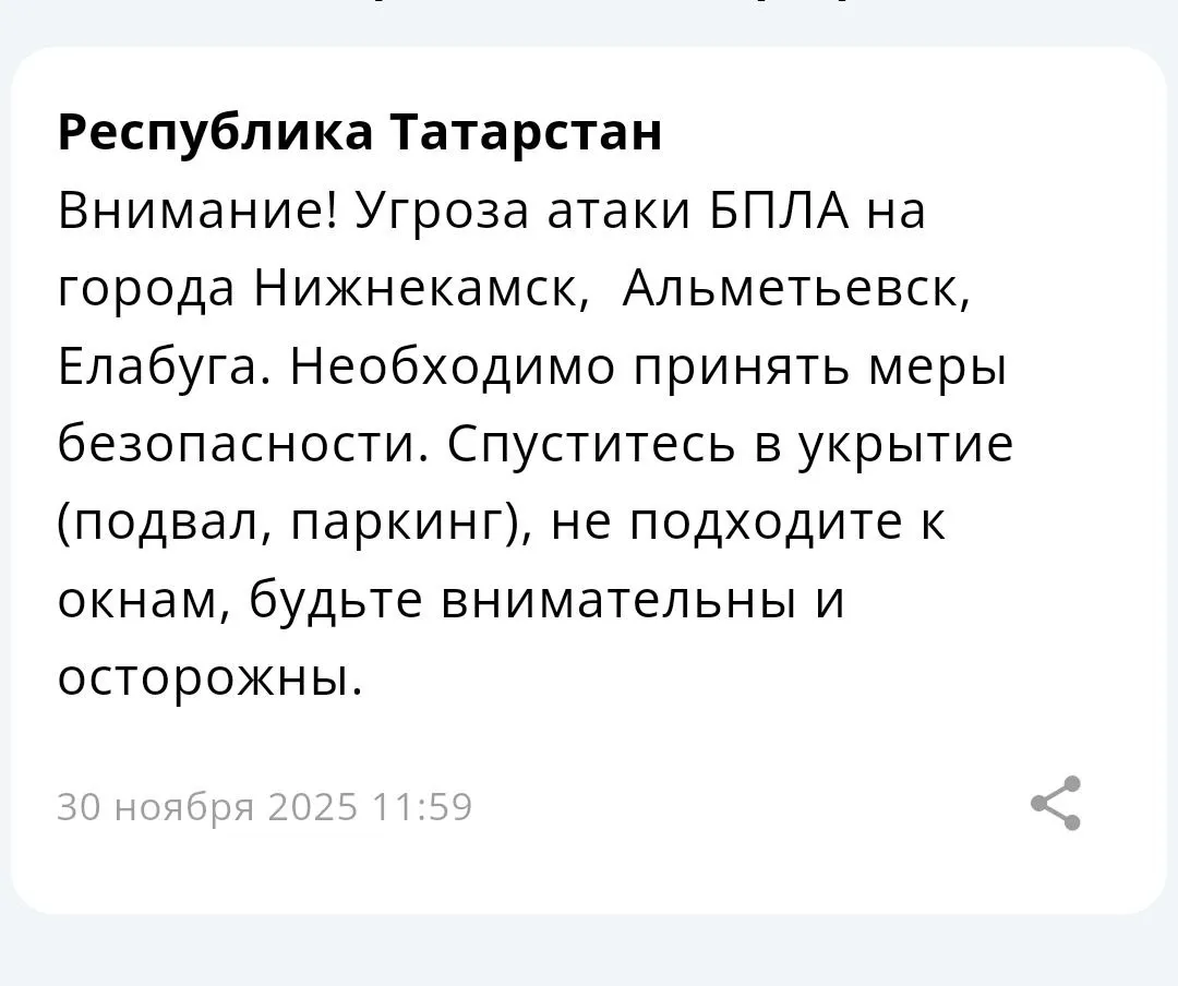 В Елабуге, Нижнекамске и Альметьевске объявлена угроза атаки беспилотных летательных аппаратов. Соответствующая информация была опубликована в официальном приложении МЧС России.