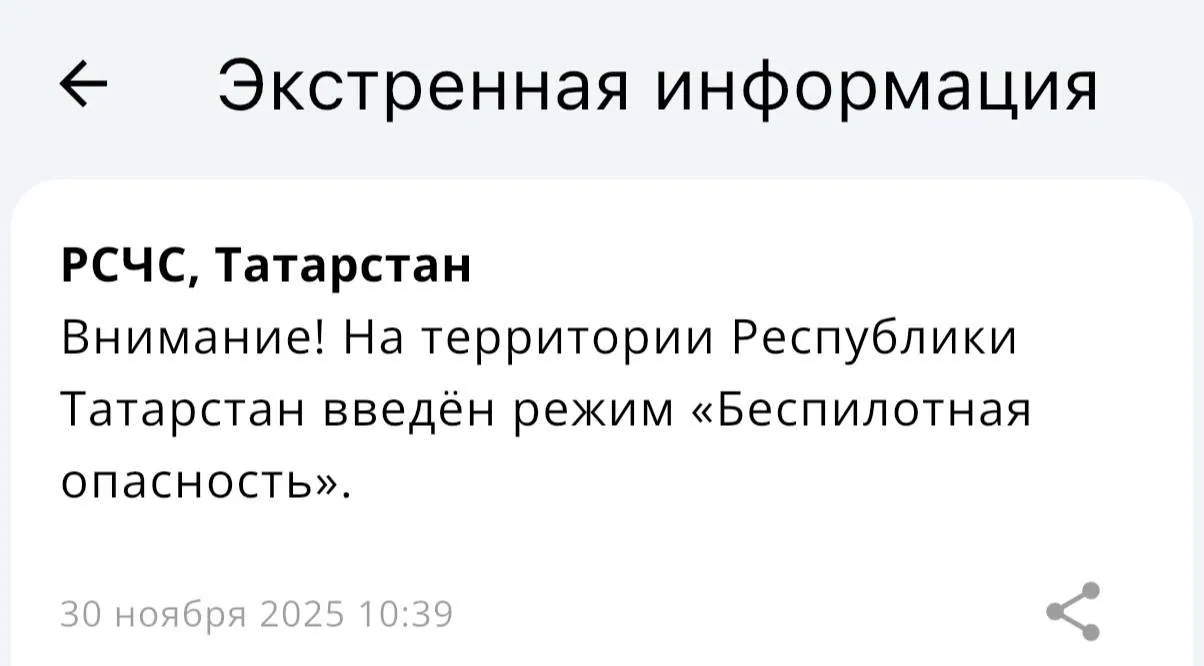 В Татарстане ввели режим «Беспилотная опасность». Сообщение появилось в официальном приложении МЧС РФ.