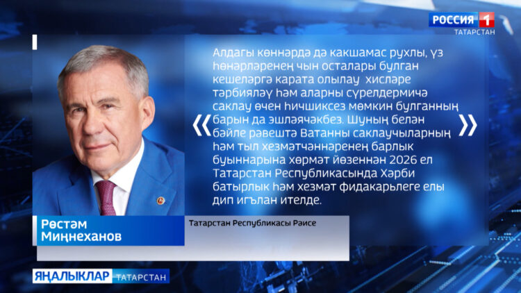 Алдагы көннәрдә дә какшамас рухлы, үз һөнәрләренең чын осталары булган кешеләргә карата олылау хисләре тәрбияләү һәм аларны сүрелдермичә саклау өчен һичшиксез мөмкин булганның барын да эшләячәкбез. Шуның белән бәйле рәвештә Ватанны саклаучыларның һәм тыл хезмәтчәннәренең барлык буыннарына хөрмәт йөзеннән 2026 ел Татарстан Республикасында Хәрби батырлык һәм хезмәт фидакарьлеге елы дип игълан ителде.