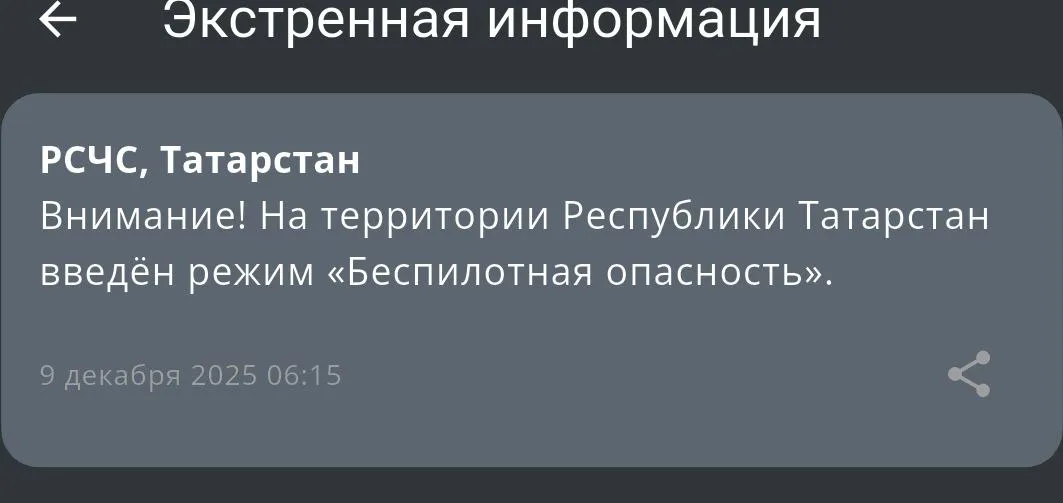 В Татарстане в 06:15 по московскому времени ввели режим беспилотной опасности. Об этом сообщили в официальном приложении МЧС России.