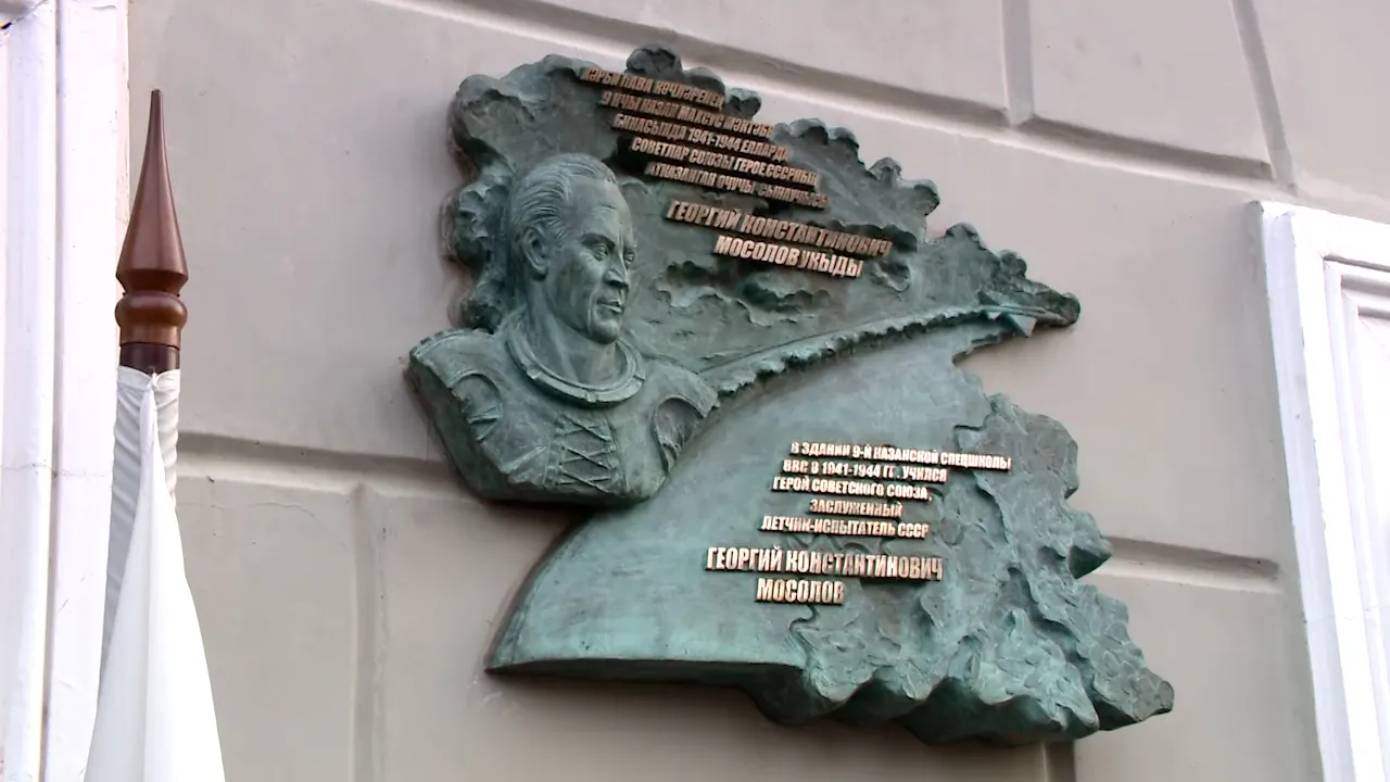 Это – третья мемориальная доска в России, в память о Георгии Мосолове. Именно в этом доме на улице Рахматуллина он провел свою юность, здесь началась его история в авиации: во время великой отечественной он обучался в девятой казанской спецшколе. Сегодня это лицей имени лобачевского и здесь есть музей известного ученика, где бережно хранят его конспекты по геометрии. Один из экспонатов – книга о героическом жизненном пути автор книги сын знаменитого летчика испытателя. Он вспоминает отца как честного, трудолюбивого, отважного человека. Ничто не могло сломить дух Георгия Константиновича, даже профессиональная травма: во время испытания самолета, пришлось катапультироваться на высоте 8 км, тяжелейшие переломы рук и ног, врачи диагностировали 2 клинической смерти. Но он все пережил.