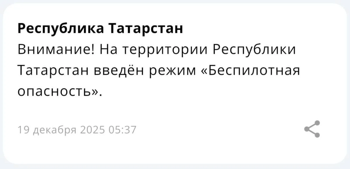 В Татарстане ввели режим «Беспилотная опасность». Уведомление появилось в официальном приложении МЧС России в 05:37.