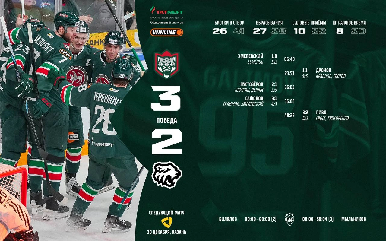 Шайбы у «Ак Барса» забросили Александр Хмелевский, Алексей Пустозеров и Илья Сафонов.