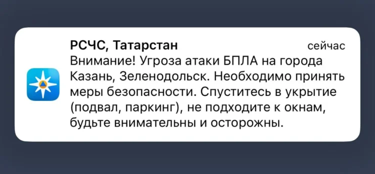 В Казани и Зеленодольске объявлена угроза атаки беспилотников. Соответствующее предупреждение размещено в официальном приложении МЧС России.