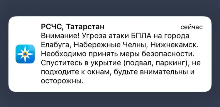 В Елабуге, Набережных Челнах и Нижнекамске объявили угрозу возможной атаки беспилотных летательных аппаратов. Информацию опубликовало официальное приложение МЧС России.