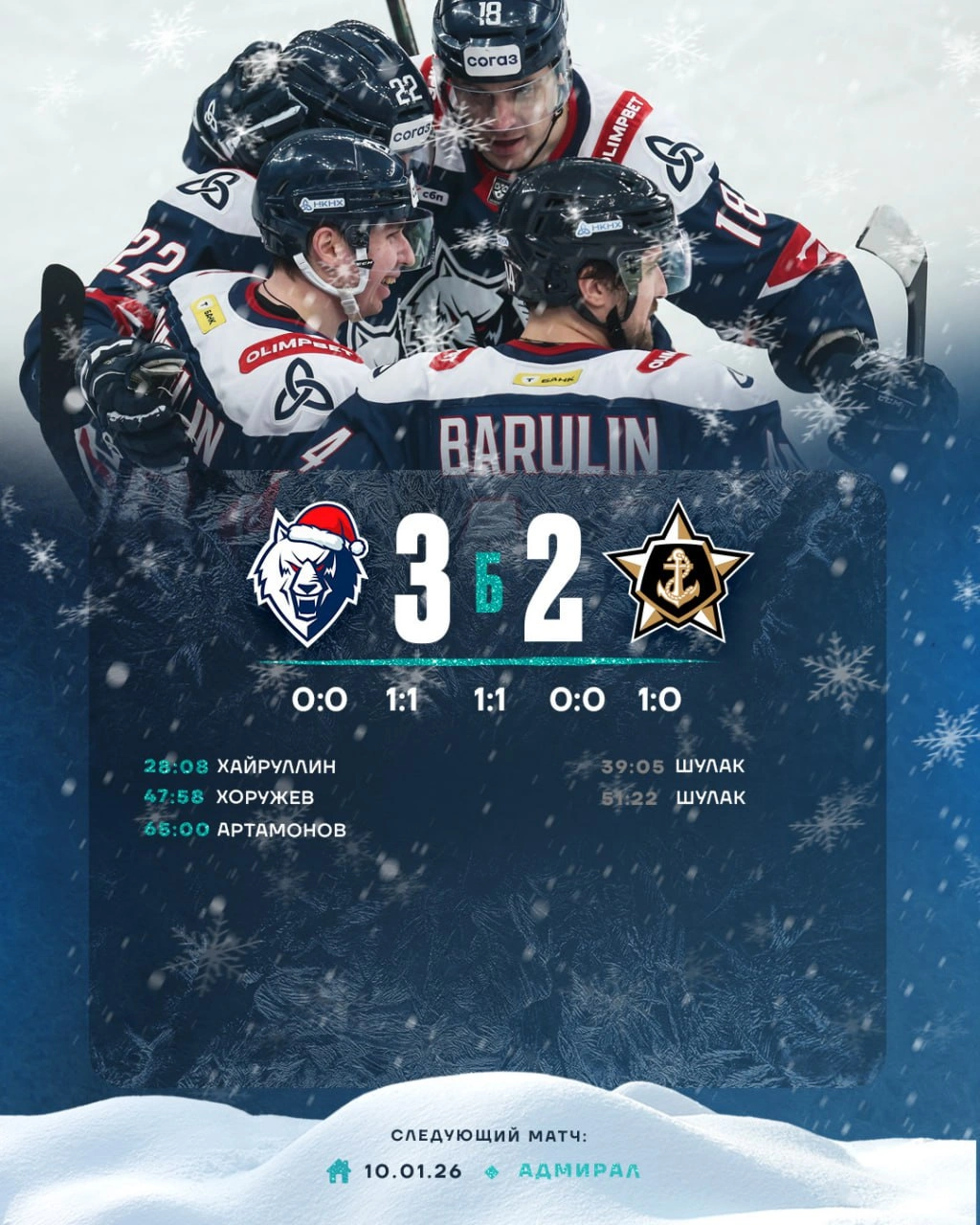 Нижнекамский «Нефтехимик» одержал победу над владивостокским «Адмиралом» в домашнем матче регулярного чемпионата КХЛ. Основное время и овертайм завершились со счетом 2:2, победитель определился в серии буллитов — 3:2 в пользу хозяев.
