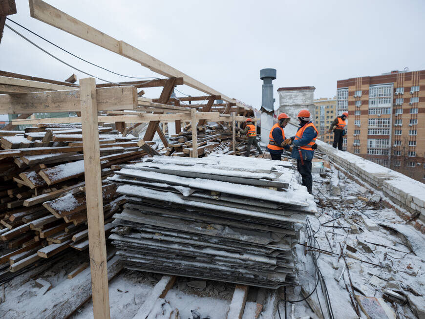 В перечень работ по этому дому вошла полная замена внутренних инженерных систем: водоснабжения, канализации, отопления и электрики, а также ремонт фасада, подвалов и кровли. Подрядная организация рассчитывает завершить кровельные работы уже к марту, хотя ранее окончание планировалось только к июлю. Специалисты отмечают, что зимняя замена холодной скатной кровли не нарушает тепловой контур здания и не повышает риск протечек.