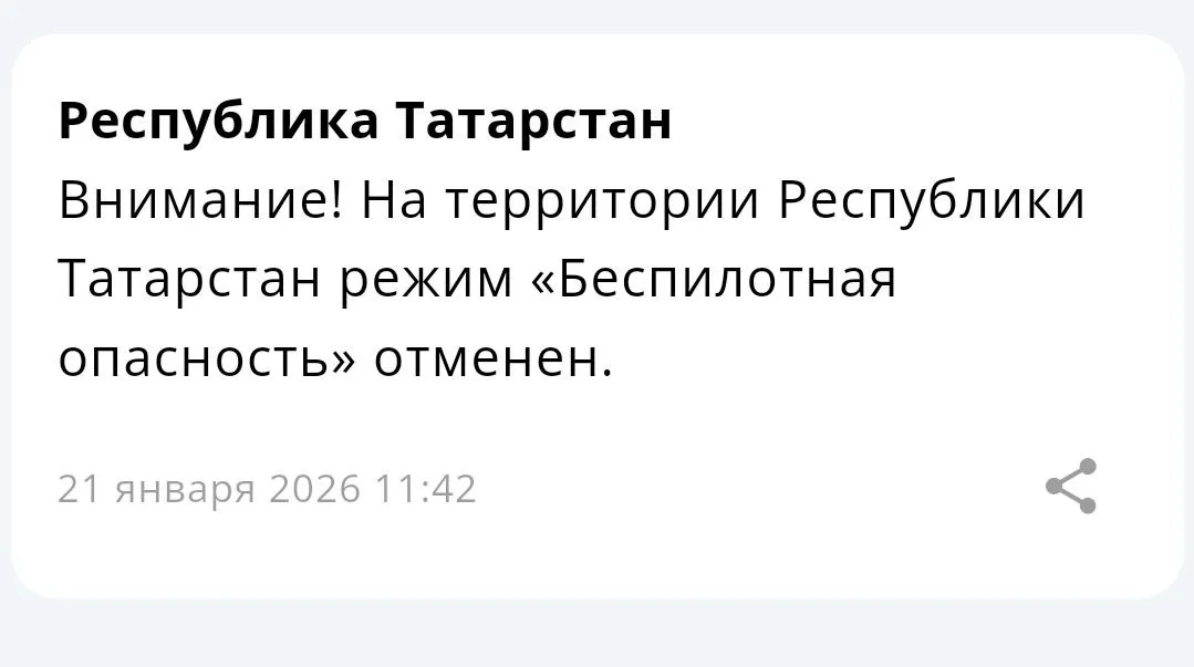 «Внимание! На территории Республики Татарстан режим «Беспилотная опасность» отменён», — говорится в сообщении официального приложения МЧС.