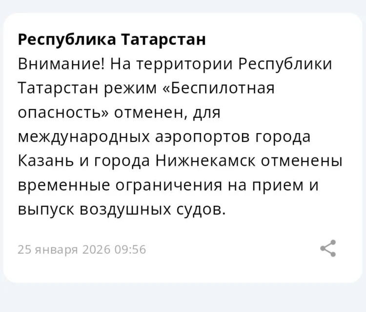 В Татарстане спустя режим «Беспилотная опасность». Об этом сообщает МЧС России.