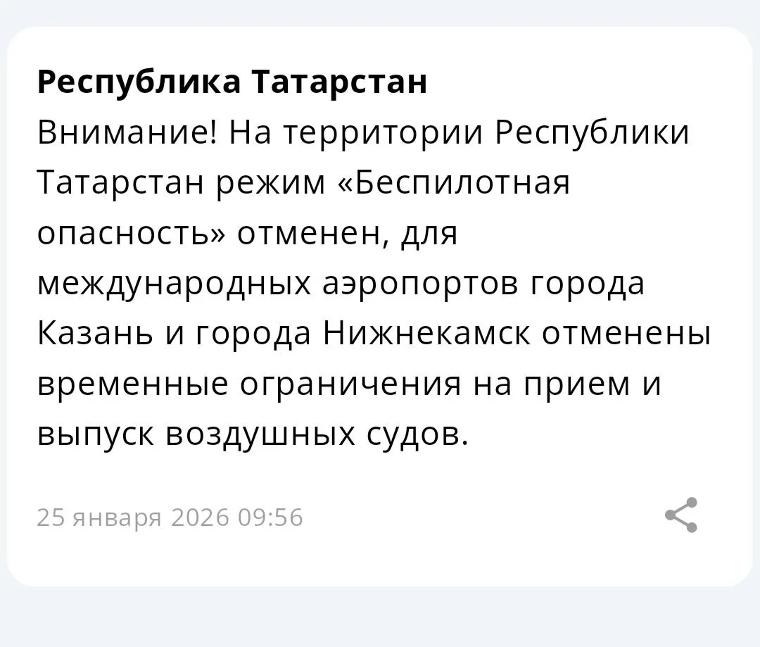 В Татарстане спустя режим «Беспилотная опасность». Об этом сообщает МЧС России.